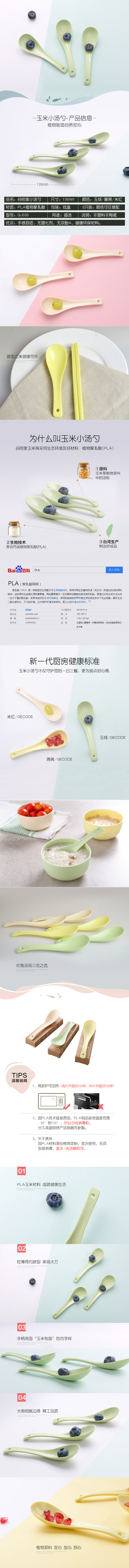 器型之美健康而作 优雅呈现五色之选 新一代厨房健康标准 玉米小汤勺不仅守护您的一日三餐,更为装点好心情 PLA玉米材料,成就健康生活 轻薄简约款型,美观大方 手柄背面“玉米制造”防伪字样 光滑细腻边缘,精工品质